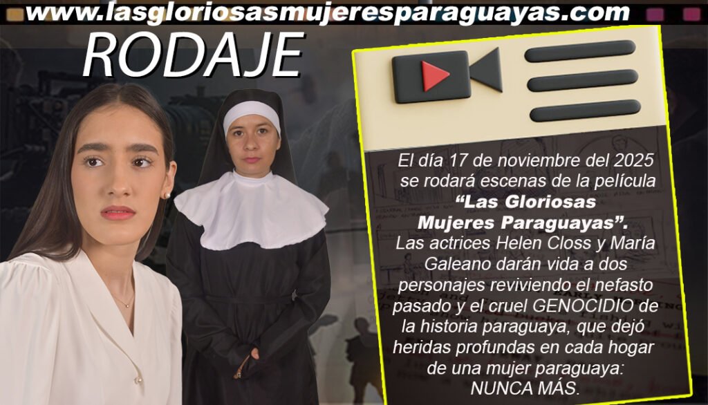 El día 17 de noviembre del corriente año, se rodará escenas de la película “Las Gloriosas Mujeres Paraguayas”. Las actrices Helen Closs y María Galeano, darán vida a dos personajes reviviendo el nefasto pasado y el cruel GENECIDIO de la historia paraguaya, que dejó muchas heridas profundas en cada hogar de una mujer paraguaya: GENOCIDIO NUNCA MÁS…